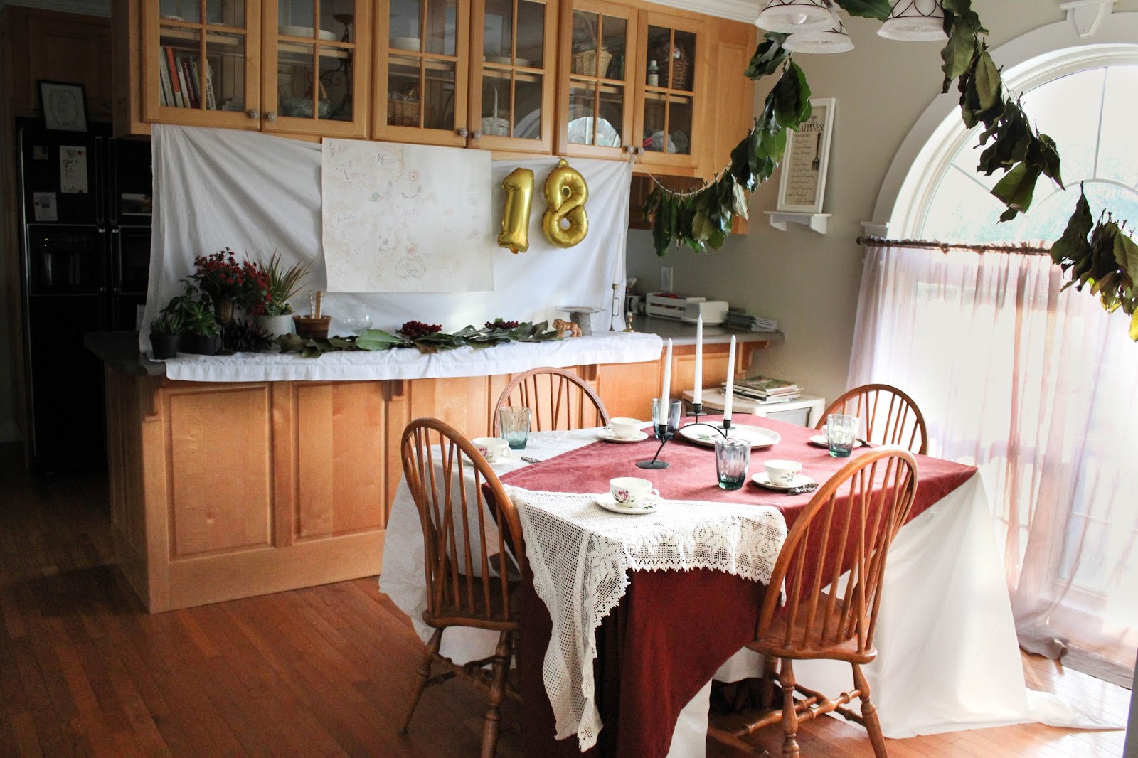 For my 18th birthday I had a Chronicles of Narnia party. Not just "The Lion, The Witch, and The Wardrobe" party, but a party inspired by the whole series. It was very simply decorated. The color scheme was green, black, white, gold, silver and burgundy. For the meals, we ate soup, bread, salad, and fruit. The next day we ate pancakes, eggs and fruit. No Turkish delight, unfortunately :( For favors, I made twig pencils and notebooks with C. S. Lewis quotes. I also made natural leaf crowns with ribbons as party hats. The leaf garlands were made from magnolia leaves (thank you to the contributor!). It was fun!