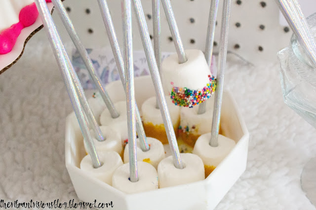 For my cousin Riley's 6th birthday party two weekends ago, she'd requested a rainbow theme, so I did a pastel, magical rainbow party with her favorite things all in pastels. For example, she loves unicorns, mermaids, fish, books, cats, and so on, so I included those silhouettes in the pastel banner I made with scrapbook paper hot-glued to ribbon. Her unicorn cake was from Ingles. I made the sparkly tablecloth-type curtain with long strands of tulle tied to a ribbon at the top. I cut out the jewel banner and the banner with her name from scrapbook paper, too. I will do a separate post on how to make the party favors. I painted the seashells with metallic nail polish. I handmade the place-cards and labels with scrapbook paper and a metallic marker or ink pen.