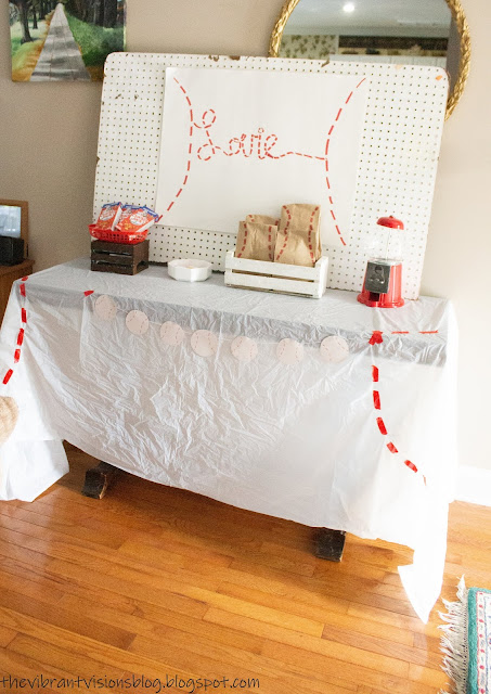 This party was from way back around the beginning of September. At this point, it can be assumed that if a party occurs during the school semester, it's very last-minute. This party was very small and simple, but would be easy to throw together yourself. The favors were yo-yos with hand-drawn and cut baseballs glued on the fronts, bags with I don't remember what inside, and cracker jacks. I drew the poster with marker, made the banner with paper, string and marker, drew lines on the bags with the same marker, and used red electric tape for the baseball lines on the tablecloth.