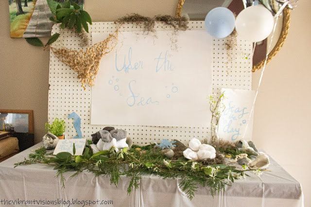 Hello, everyone! I hope everyone is faring well. Today I'd like to share a birthday party for my grandfather I did last weekend. The theme I went with was "Under the Sea" since I wanted to do something unique and he loves the ocean. I used lots of plants gathered from outside, three bags of moss from Dollar Tree (one I had on hand already), seashells my brothers and I have found on trips over the years, gold coins from Dollar Tree, scrapbook-paper sea creatures I cut out, two (fake) pearl necklaces someone gave me for costumes a long time ago, and flowering branches from our Bradford Pear tree. For favors, I wrapped rubber bands around washcloths to turn them into basic fish shapes. The dishes were from my party supply stash (and came from thrift stores). I painted the signs and posters with light blue Apple Barrel acrylic paint, and got the ideas for some of those from this 100 Layer Cakelet party. Using these materials, I fashioned what I hope resembled an underwater seascape. I added the fishing net I made for his Seaside Birthday Party, the only white/clear balloons I had, and a Dollar Tree star balloon. The color scheme I was going for was natural browns and greens,white, pastel blue, and silver.