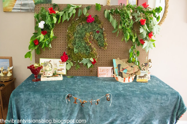 Hey everyone, it's been so long and I have so much to share with you! For Riley's eighth birthday way back in June, she requested a "Black Beauty" and rose-themed birthday party. I made the moss-covered horse hanging up with a few roses using a poster, Elmer's glue and spray glue, a mix of live and fake moss, and roses from outside. I made the party favors from recycled cardboard and Dollar Tree combs (they came in packs) or brand new combs I had on hand. I found a vintage book about horse breeds at a local antique store located at what everyone nearby calls "The Mill". I made the metallic banner, sign and number eight with paper plates and markers. The other decorative pieces were handmade, from thrift stores, borrowed or given to me.