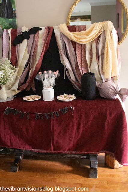Hello, today I am excited to share a party I never posted from way back in September I did for my grandma. I had no idea what theme to do, and I was inspired when sometime near her birthday she mentioned how she loved licorice, which I already knew, but in desperation for a theme a thought that perhaps licorice could be my theme. Her birthday is the month before Halloween, so I ended up doing not only licorice and sweets for the décor, but also a bat and dark, moody/elegant colors like burgundy and black with blush pink, other pinks, and tan. I used fabric cut into long strips for the background of the display (from fabric donated to me as I mentioned in a previous post and had on hand), all looped around a string or fabric strip at the top. I draped the fabric over a pegboard. I made matching kabob sticks with Dollar Tree candies and licorice, and also got Dollar Tree cookies. The big pink candy decoration was fabric tied around a balloon. The licorice stick decoration next to it was black fabric hot-glued to a recycled protein powder container. The licorice-looking word banner was made of hot glue on cardstock letters all painted black.